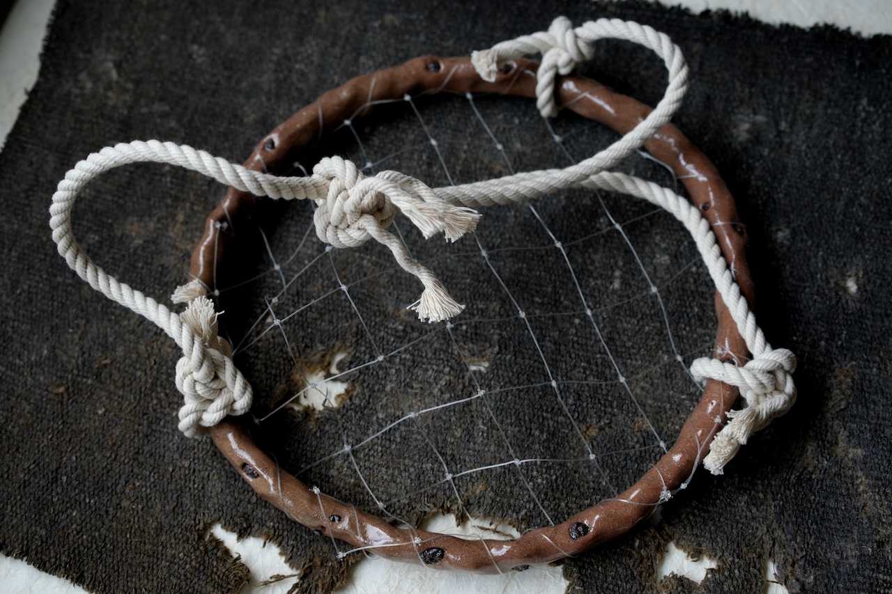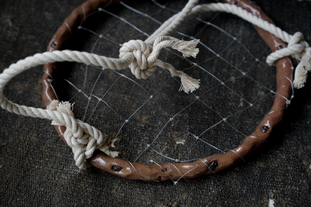 陶器の質感と、柔らかい糸で編まれたあたたかみのある台座。