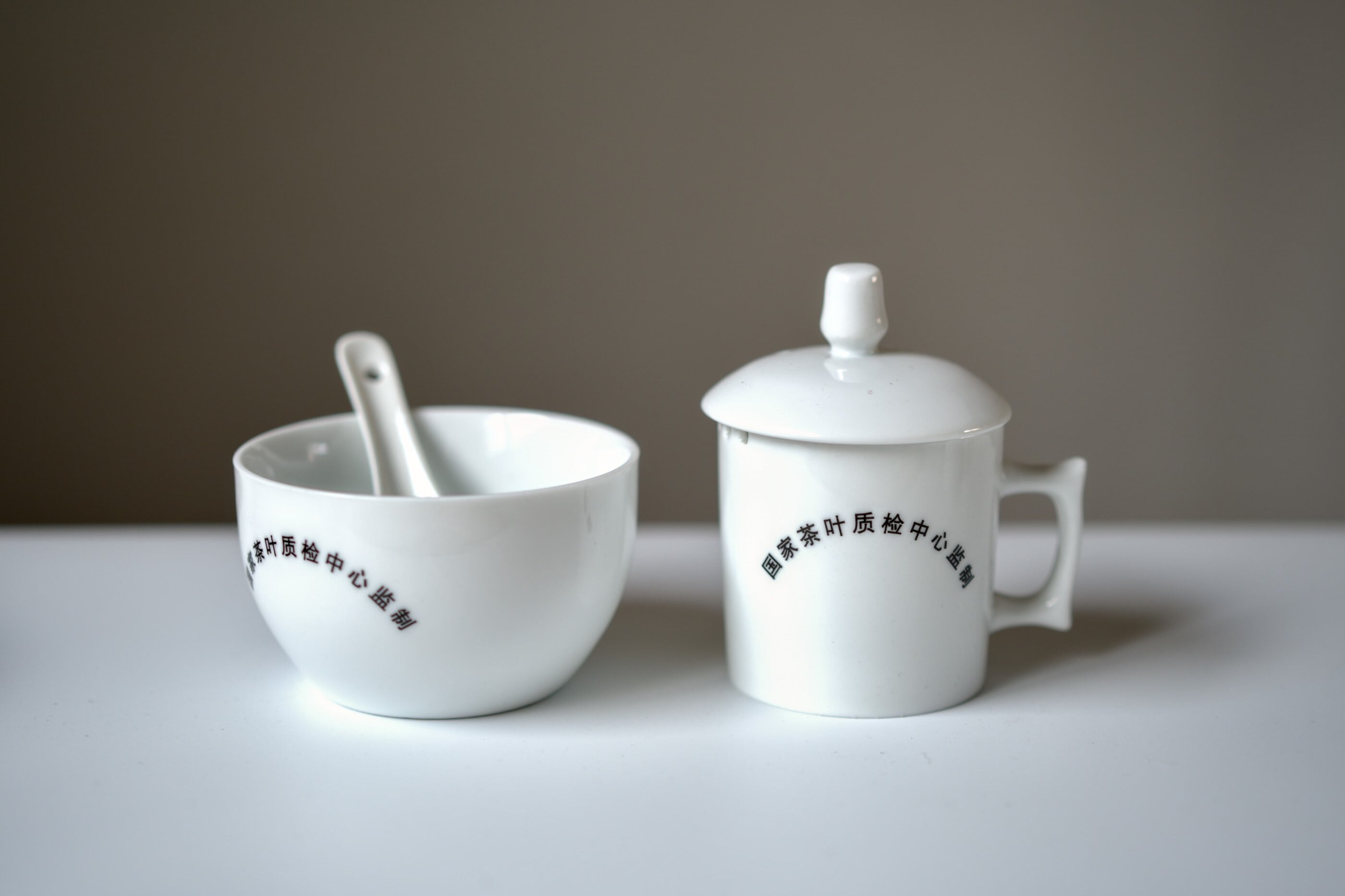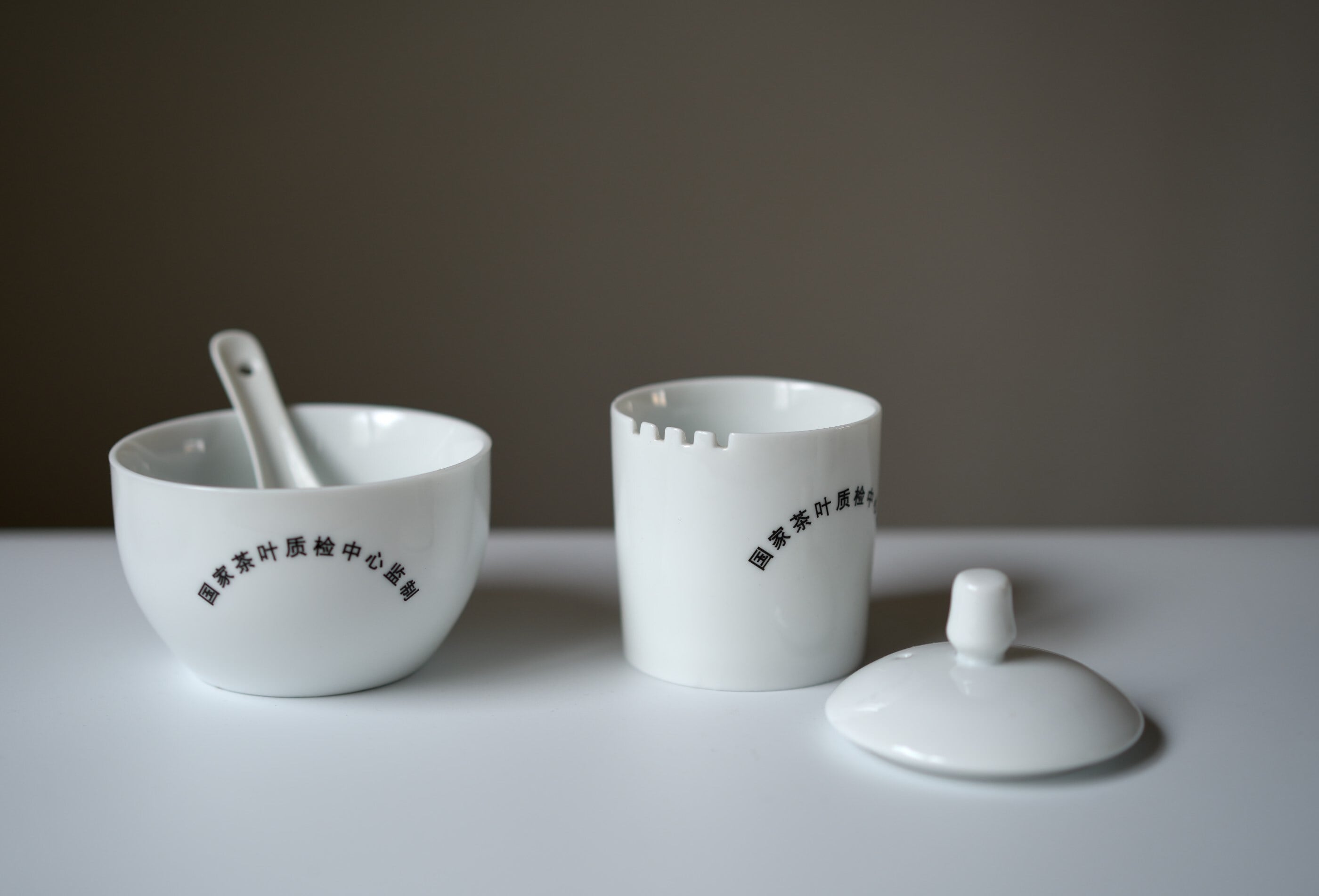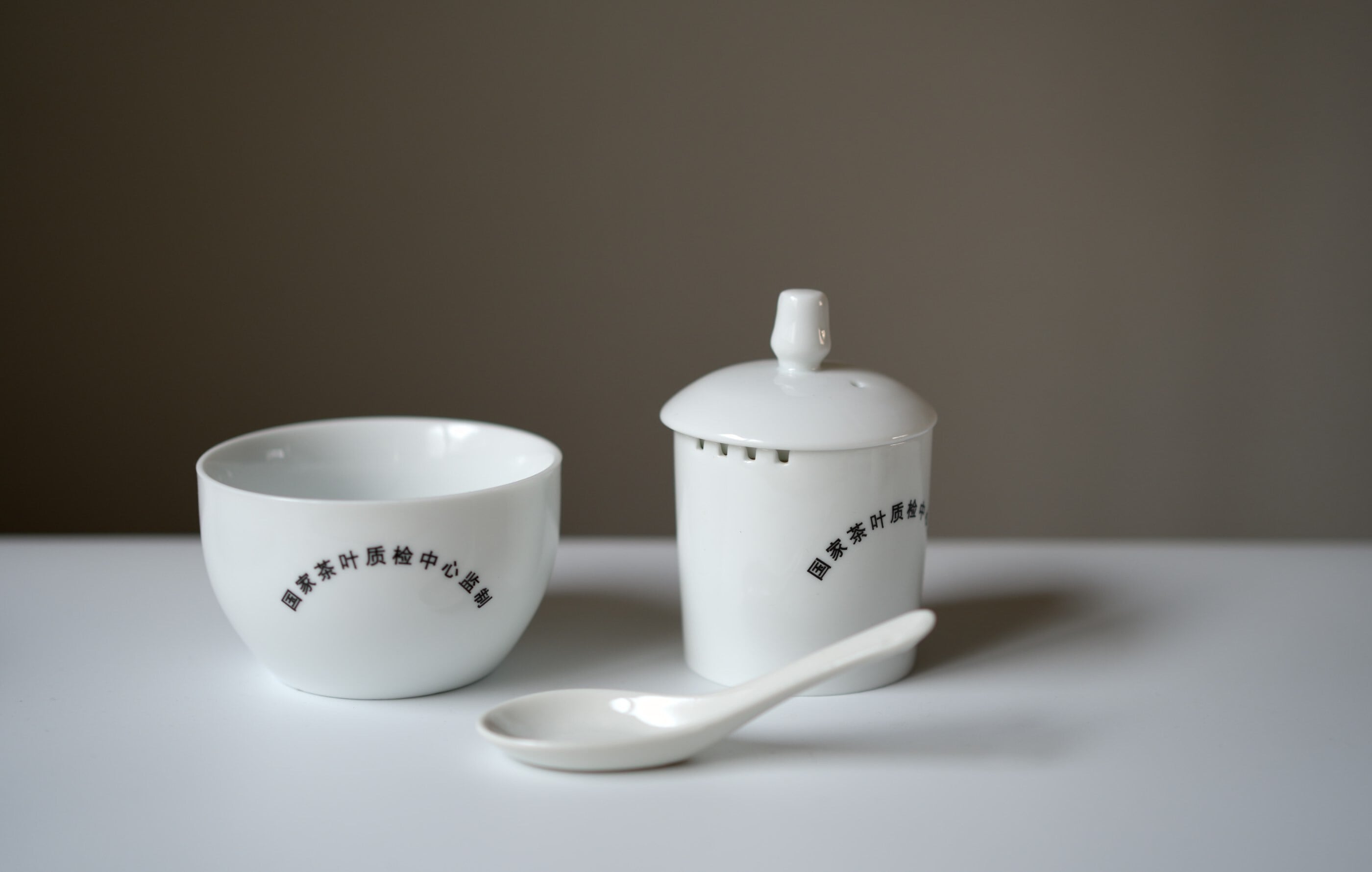 本セットは、蓋碗・審評碗・審評スプーンで構成された、中国緑茶の官能審評および比較テイスティング用の茶器です。
